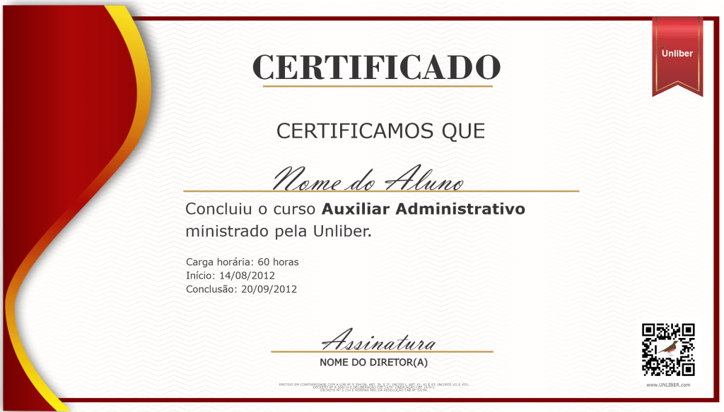 BASE LEGAL DO CERTIFICADO: Todos os certificados emitidos pela Unliber seguem a base legal da Lei nº 9394/96, do Decreto Presidencial n° 5.154, de 23 de julho de 2004, Art. 1° e 3° e as normas do Ministério da Educação (MEC) pela Resolução CNE n° 04/99, Art. 11, referente a educação continuada do trabalhador.