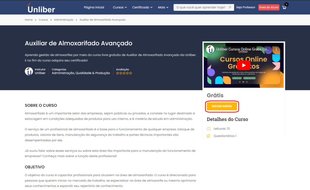 4 – O cadastro em nosso portal dá acesso irrestrito ao conteúdo de todos os cursos. Você escolhe um de nossos cursos e estuda o material disponibilizado gratuitamente. Basta clicar em “Iniciar Agora”.