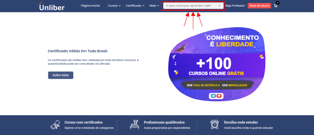 3 – PRONTO! Após ter feito seu cadastro, você poderá escolher e assinar os cursos que forem de sua preferência. Para isso, basta clicar no botão “Cursos” no menu principal e depois escolher o curso que mais lhe agradar. Se preferir, também é possível digitar o nome do curso na barra “O que você quer aprender hoje?”.