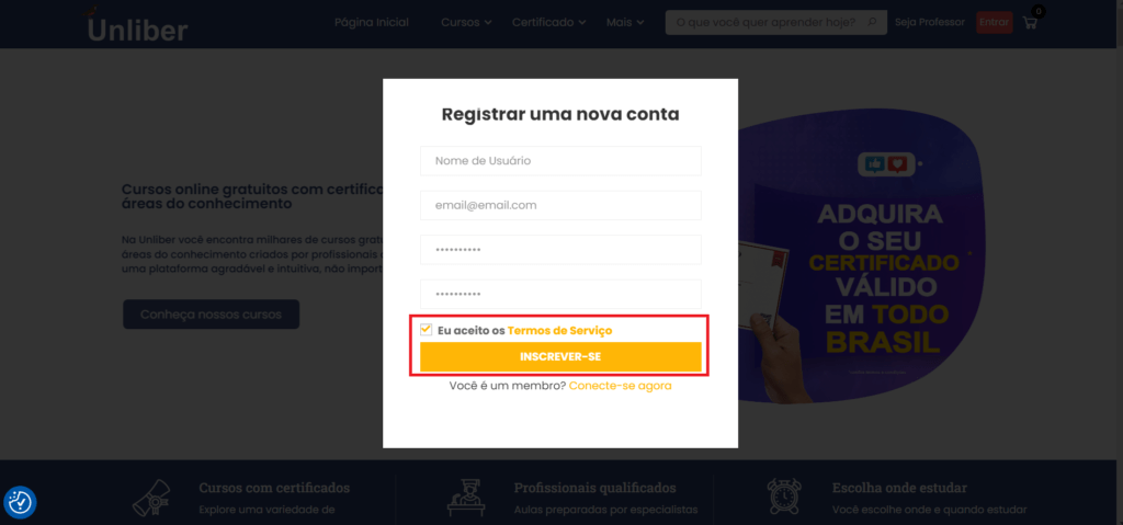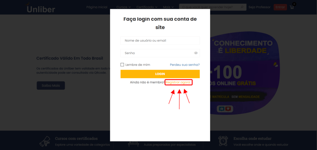 1 – O primeiro passo para iniciar seus estudos com na Unliber é fazer seu cadastro em nosso site. Para isso, basta clicar em “Entrar” e depois em “Registrar Agora“.